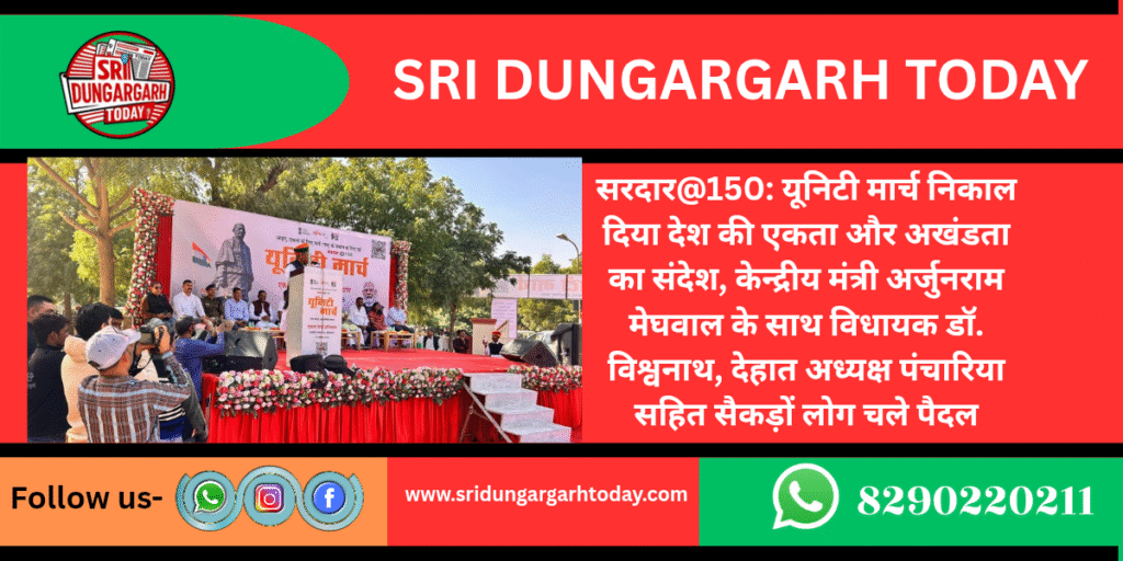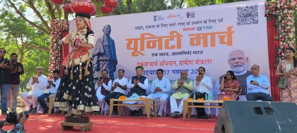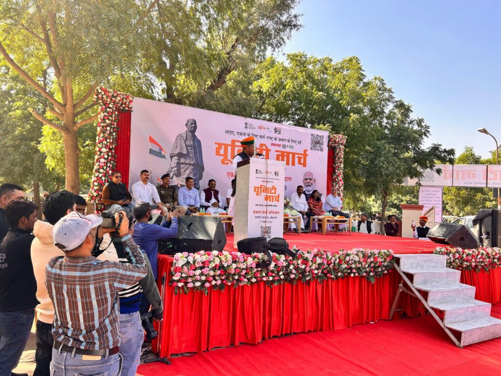 सरदार वल्लभभाई पटेल की 150वीं जयंती के अवसर पर आयोजित किए जा रहे कार्यक्रमों की श्रृंखला में सोमवार को सरदार@150 यूनिटी मार्च निकाली गई। माई युवा भारत की ओर से किसान भवन से स्वामी केशवानंद राजस्थान कृषि विश्वविद्यालय तक आयोजित यूनिटी मार्च का नेतृत्व केंद्रीय कानून मंत्री अर्जुन राम मेघवाल ने किया और पूरे मार्ग पैदल चलकर देश की एकता और अखंडता का संदेश दिया।