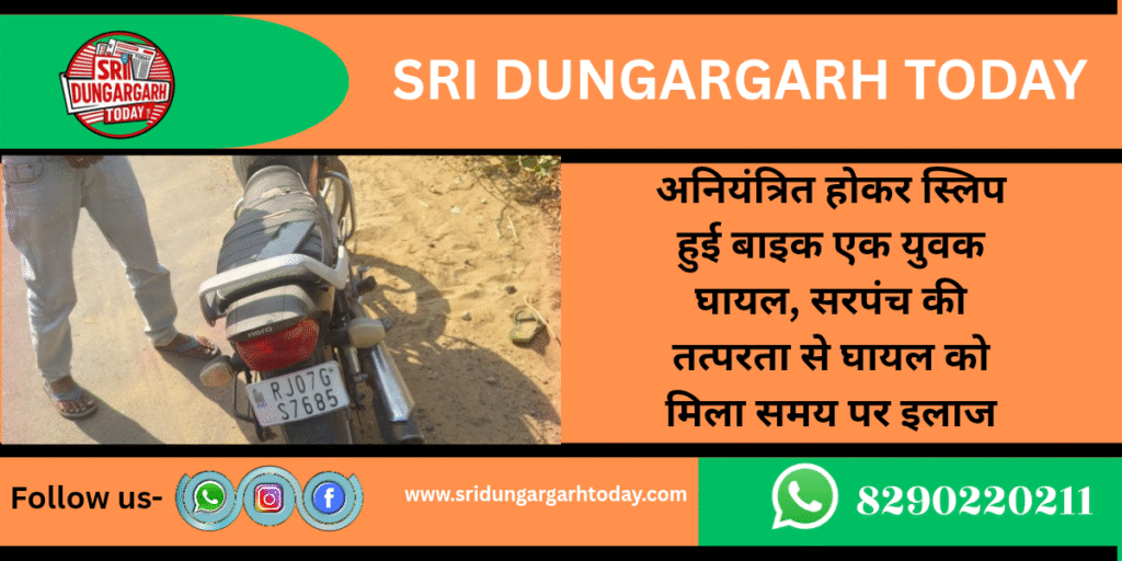 अनियंत्रित होकर स्लिप हुई बाइक एक युवक घायल,सरपंच की तत्परता से घायल को मिला समय पर इलाज