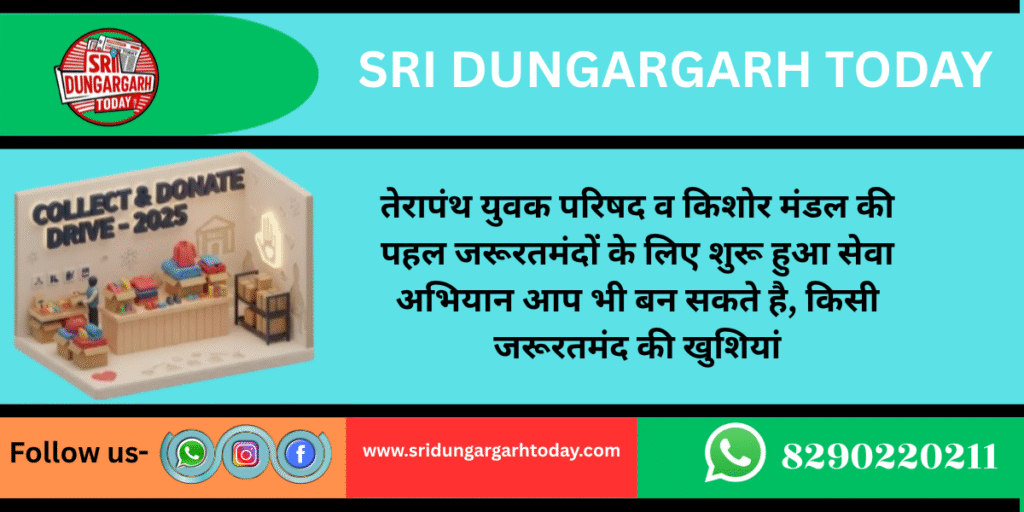 तेरापंथ युवक परिषद एवं तेरापंथ किशोर मंडल, श्रीडूंगरगढ़ द्वारा वर्ष 2025 में मानव सेवा को समर्पित “Collect & Donate Drive” की शुरुआत की है। , जिसका उद्देश्य समाज में उपयोग योग्य वस्तुओं को एकत्रित कर उन्हें जरूरतमंद परिवारों तक सम्मानपूर्वक पहुँचाना है।