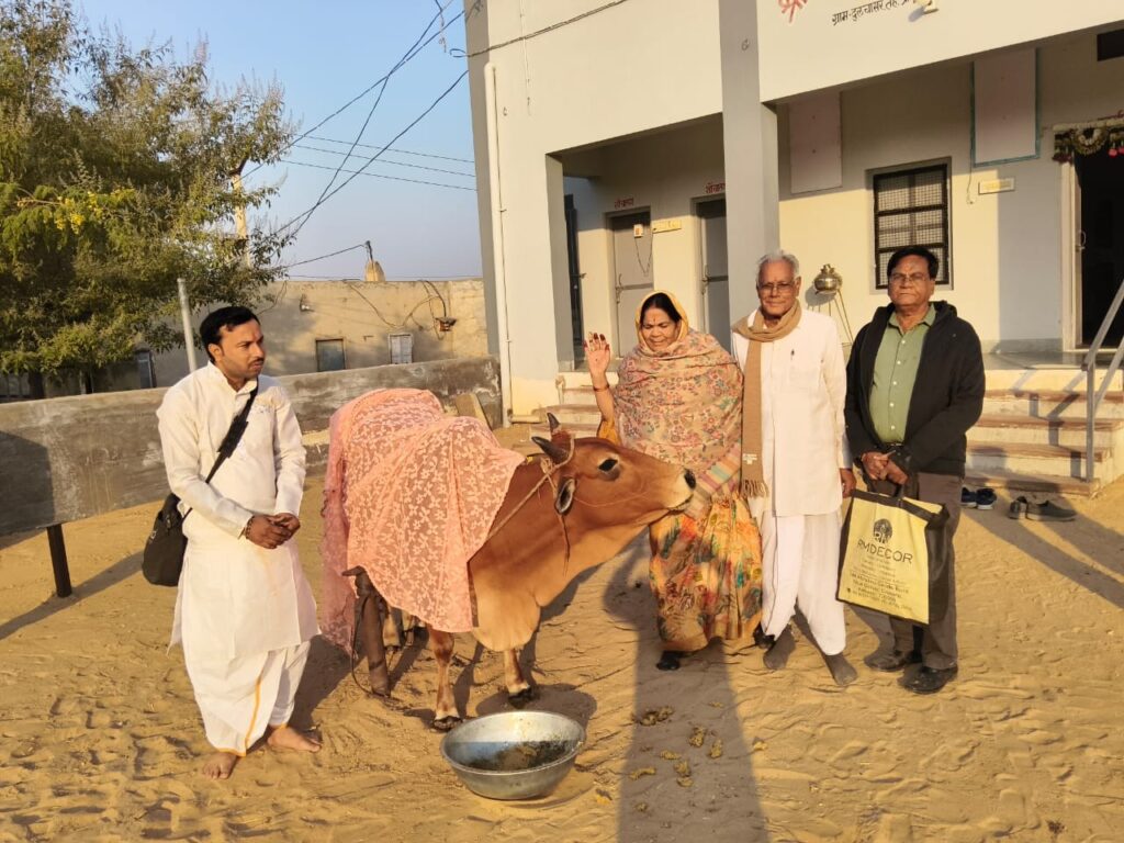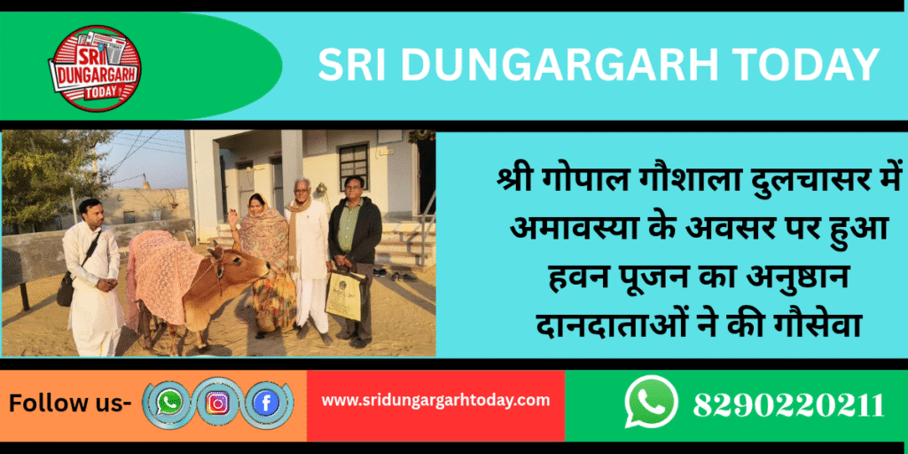 श्री गोपाल गौशाला दुलचासर में अमावस्या के पावन अवसर पर गुरुवार को हवन व गौपूजन का आयोजन किया गया। पंडित विजय कुमार जाजड़ा ने विधिवत रूप से मंत्रोच्चार के साथ अनुष्ठान संपन्न करवाया हवन अनुष्ठान में यजमान के रूप में पूनमचंद मूंधड़ा निवासी दुलचासर सपत्नीक शामिल हुए। सचिव रेवंतसिंह पड़िहार ने बताया कि अमावस्या पर मनोहर लाल मुंधड़ा अपने परिवार सहित गौशाला में पधारकर गौमाता को गुड़ का पावन भोग लगाया। वहीं एक पेटी गुड़ मूलचंद जाजड़ा, एक झाल मुंगफली चारा चतर सिंह पड़िहार ने समर्पित किया। गौशाला की गौ माताओं को लापसी का भोग गुप्त दानदाता द्वारा लगाया गया। गौशाला कमेटी ने दानदाताओ का आभार प्रकट करते हुए ईश्वर से सदैव सुख समृद्धि की कामना की।