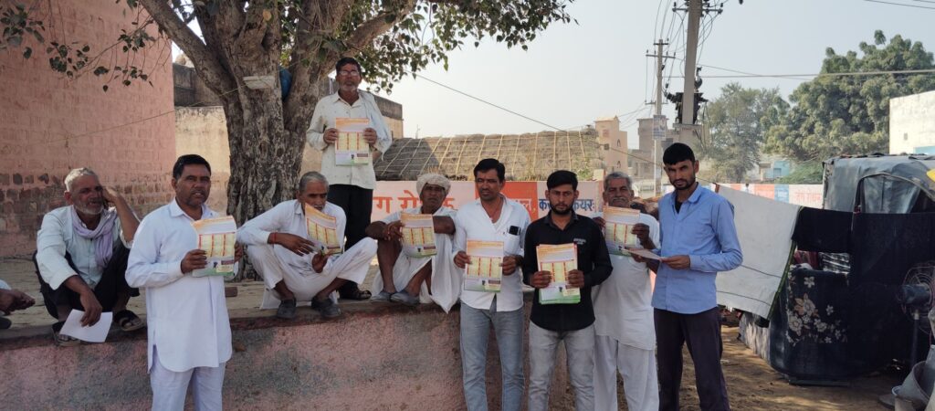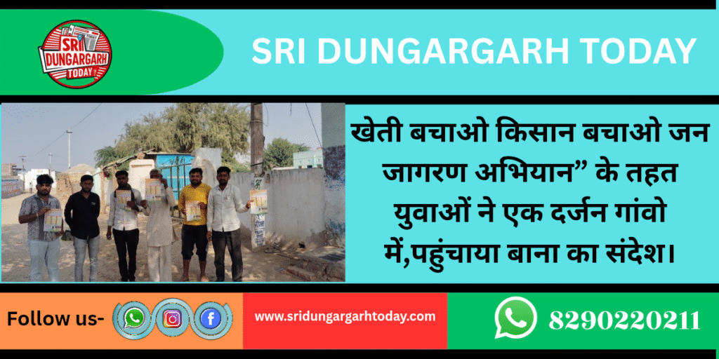 श्रीडूंगरगढ़। सरकार द्वारा खेती को घाटे का सौदा बनाकर किसान वर्ग की जमीने व्यापारी घरानों को बेचने की तैयारी कर रही है। इसी लिए अंचल में जन जागरूकता अभियान चला कर जन जन तक खेती बचाओ किसान बचाओ का संदेश कांग्रेस के युवा कार्यकर्ता दे रहें है। ये जानकारी देते हुए कांग्रेस के युवा नेता हरिराम बाना ने बताया कि अभियान के तहत पत्रक लेकर युवाओं की टोली आज अंचल के एक दर्जन गांवो में पहुंची और ग्रामीणों को जानकारी देते हुए एकजुट होकर संघर्ष करने की बात कही। बाना ने बताया कि ये षड्यंत्र पूर्वक हो रहा है, जिसे आमजन को समझना होगा। बाना ने बताया कि गुरूवार को टोली अंचल के गांव हेमासर, बेनीसर, भोजास, लखासर, समंदसर, मणकरासर, बींझासर, लोढ़ेरा, गुंसाईसर बड़ा, जैतासर, तोलियासर, ठुकरियासर पहुंचे और पत्रक का वितरण किया।