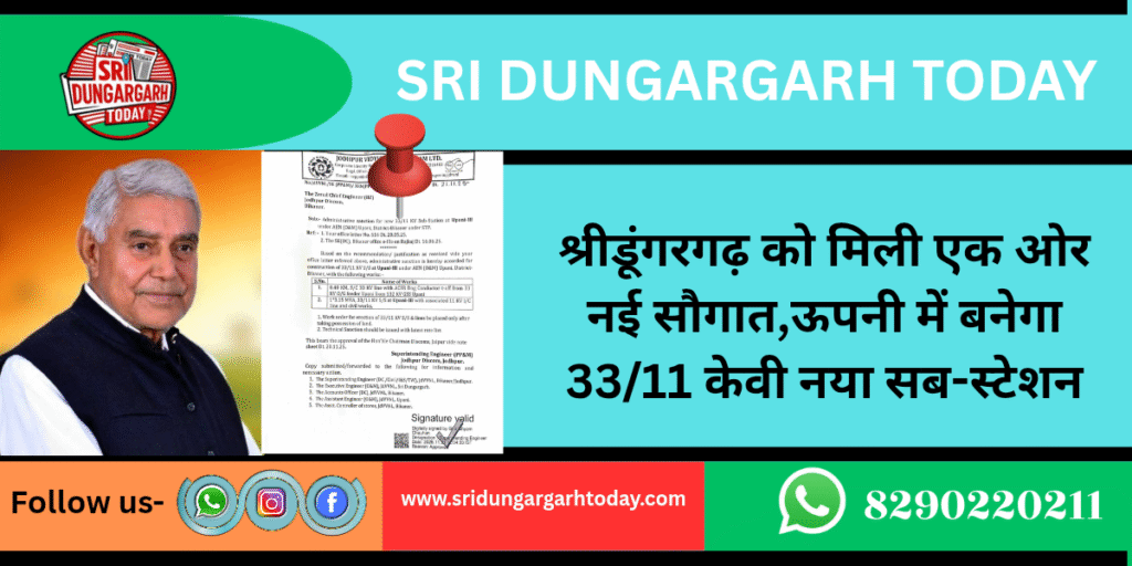 श्रीडूंगरगढ़ विधानसभा क्षेत्र को एक और नई सौगात मिली है। विधायक ताराचंद सारस्वत के प्रयासों से ऊपनी में नया 33/11 केवी सब-स्टेशन स्वीकृत हो गया है। जोधपुर डिस्कॉम, बीकानेर के जोनल चीफ इंजीनियर ने इस परियोजना को प्रशासकीय मंजूरी दे दी है।
