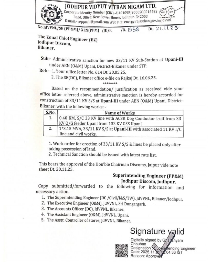 जोधपुर डिस्कॉम द्वारा जारी प्रशासनिक मंज़ूरी के तहत 0.40 किमी 33 KV लाइन, ACSR डॉग कंडक्टर सहित 33 KV उपनी से 132 KV GSS तक लाइन निर्माण कार्य किया जाएगा।