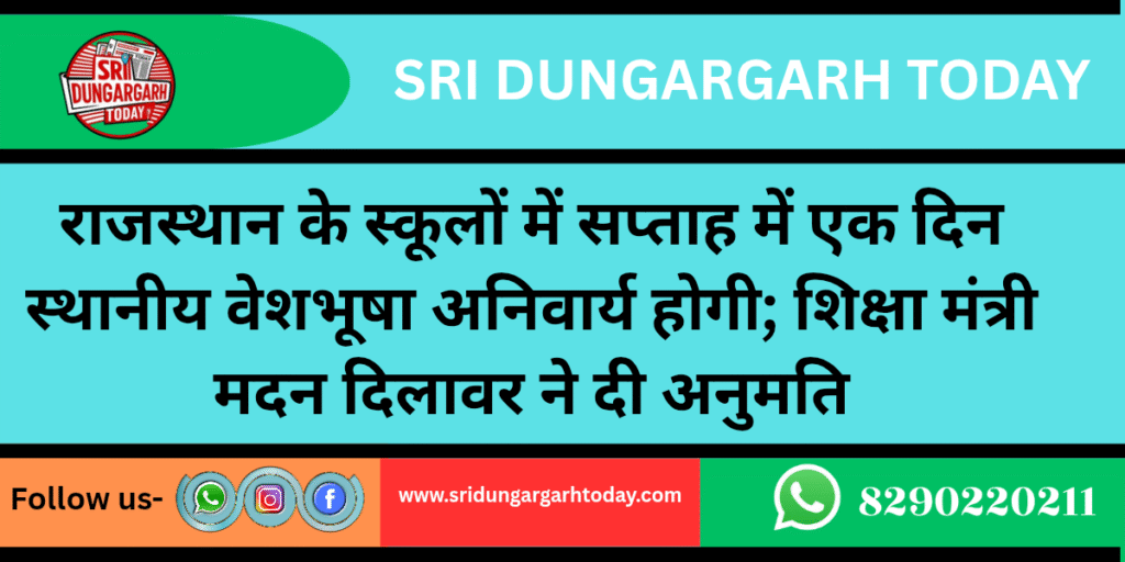 राजस्थान के शिक्षा एवं पंचायती राज मंत्री मदन दिलावर ने राज्य के सभी स्कूलों में सप्ताह में एक दिन स्थानीय वेशभूषा पहनकर स्कूल आने के भारत सरकार के प्रस्ताव को स्वीकृति दे दी है। मंत्री ने शिक्षा विभाग के अधिकारियों को इस संबंध में आवश्यक कार्रवाई करने के निर्देश जारी कर दिए हैं।