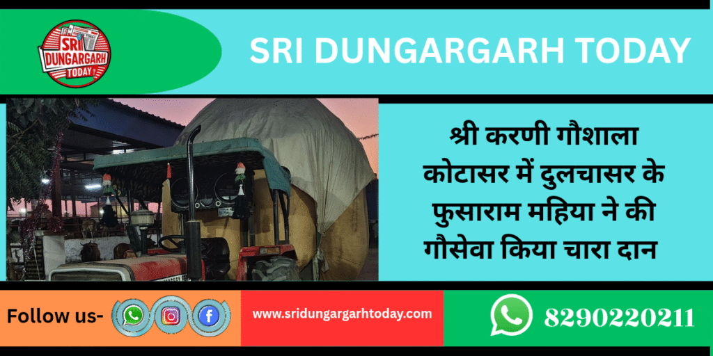श्री करणी गो सेवा समिति गौशाला के भामाशाह फुसाराम सुपुत्र दिवंगत आशुराम महिया दुलचासर ने मंगलवार को गौशाला की गौ माताओं के लिए एक ट्रॉली 22 क्विटंल 51किलो मूंगफली का चारा गोवंश के लिए समर्पित कर गौ सेवा का सौभाग्य प्राप्त किया गौशाला कमेटी ने महिया परिवार के सुख समृद्धि की कामना करते हुए आभार जताया गौशाला प्रबंधक ने बताया कि महिया परिवार समर्पित भाव से लंबे समय से गौशाला से जुड़ा हुआ हैम और परिवार द्वारा अनवरत गौसेवा निरंतर जारी है।