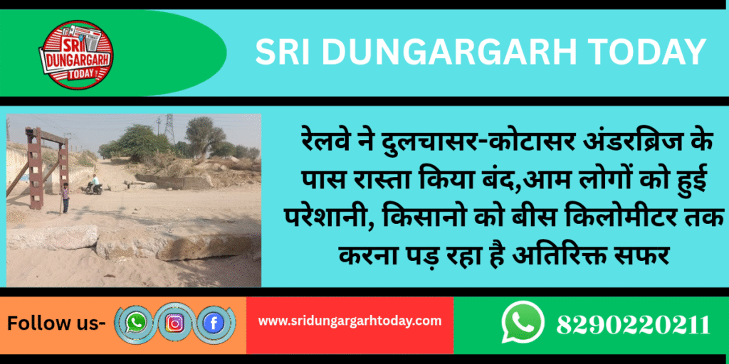 उत्तर-पश्चिम रेलवे के बीकानेर-रतनगढ़ रेल खंड पर पूर्व सूचना एवं मोहलत की अवधि पूरी होने पर शनिवार शाम को रेलवे द्वारा दुलचासर-कोटासर अंडरब्रिज के पास तिराहे मार्ग के दो तरफा रास्ता आवागमन के लिए बंद कर दिया गया। रेलवे द्वारा बासी महियान, खरळा व गोनाणा रोही एवं कालछा रोही के खेतों की ओर रेलवे की जमीन से गुजरने वाले दो तरफ के रास्ते आमजन के परिवहन साधनों के आवागमन के लिए अस्थाई रूप से पत्थर लगाकर बंद कर दिए जाने आम लोगों को परेशानी हुई। रेलवे ने इस रेलखंड मार्ग रेलगाड़ियों के सुरक्षित संचालन के लिए रेलपटरियों के सामानांतर पास से गुजरने वाले रास्तों के पास पहले तारबंदी की और ग्रामीणों के द्वारा मांगी गई समय सीमा पूरी होने पर अंडरब्रिज के दो तरफ रेलपटरी के सामानांतर चलने वाले रास्तों को एकबारगी अस्थाई रूप से बड़े-बड़े पत्थर डालकर बंद कर दिए गए है। इन दोनों रास्तों के बंद होने इन दोनों रास्तों पर अपने-अपने खेतों आने-जाने वालों को काफी परेशानी हुई और लोगबाग पत्थरों को पैदल लांघते नजर आए। वाहनों को गांव व रोही के मार्ग के दोनो ओर छोड़ना पड़ा। ग्रामीणों व किसानों ने रेलवे की कार्रवाई पर रोष जताते हुए कहा कि खेतों में फसल निकली हुई पड़ी है और चारा भी खेतों में पड़ा है। रास्ता बंद होने से ये परिवहन नहीं होंगे।