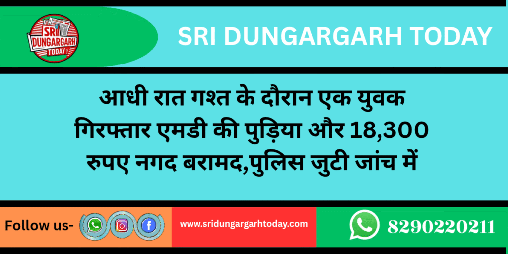 आधी रात बाद गश्त के दौरान पुलिस ने एक युवक को एमडी बेचने के आरोप में गिरफ्तार किया है। घटना रविवार देर रात करीब 1.30 बजे हेमासर फांटा के पास की है।