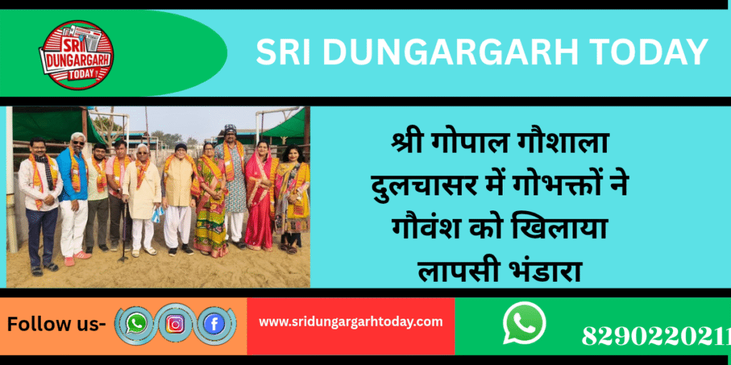 श्री गोपाल गौशाला दुलचासर में गुरुवार को मोतीलाल, हुकम चंद, मनोहर लाल, नंदकिशोर मुंधड़ा निवासी दुलचासर प्रवासी मुंबई ने गौशाला पधारकर गौशाला का भ्रमण कर अवलोकन किया इस अवसर पर गौशाला की त गौमाताओं को पोष्टिक आहार लापसी का पावन भंडारा कर अपने हाथों से भोग लगाया है। सचिव रेवन्त सिंह पड़िहार ने बताया कि भंडारा वितरण में इंदिरा देवी मुंधड़ा रोहित मूंधड़ा, राहुल करनानी, जितेंद्र मुंधड़ा,निलेश,पिंकी मुंधड़ा, ज्योति तापड़िया सहयोग कर गौ सेवा कर गौ माता से आशीर्वाद प्राप्त किया। गौशाला कमेटी ने सभी दानदाताओं का दुपट्टा पहनाकर स्वागत किया। तथा ईश्वर से सदैव सुख समृद्धि कि कामना करते हुए आभार जताया।