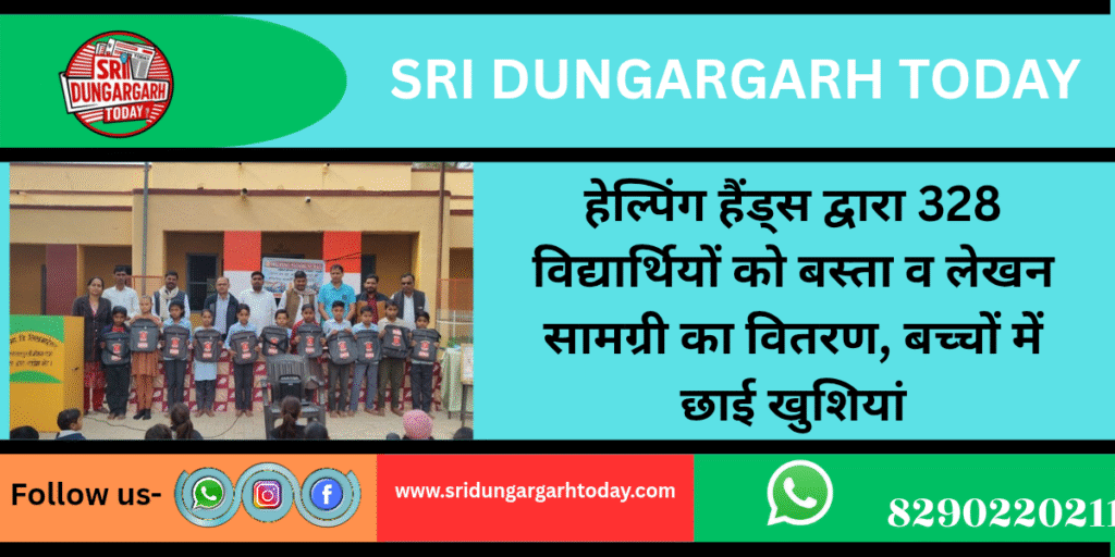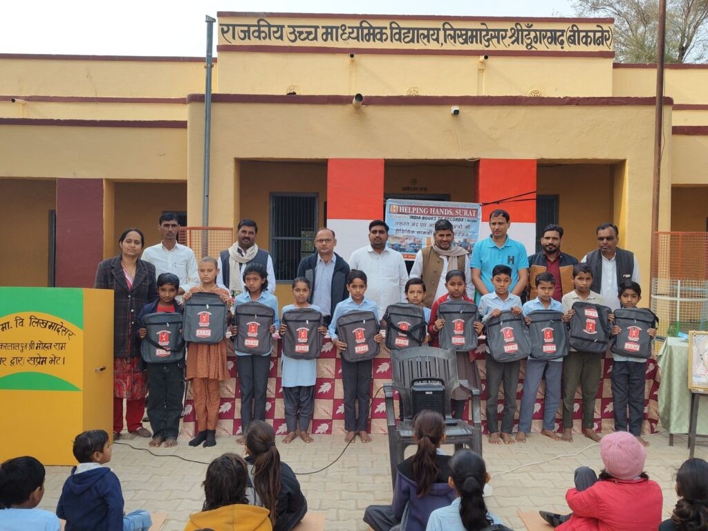 हेल्पिंग हैंड्स, सूरत के सहयोग से शुक्रवार प्रात: 10 बजे राजकीय उच्च माध्यमिक विद्यालय लिखमादेसर, श्रीडूॅंगरगढ़ के प्रार्थना प्रांगण में एक विशेष कार्यक्रम आयोजित किया गया। कार्यक्रम अधीनस्थ दो प्राथमिक विद्यालयों सहित कक्षा 1-12 के जरूरतमंद कुल 328 विद्यार्थियों को बस्ता व लेखन सामग्री का वितरण किया गया।
