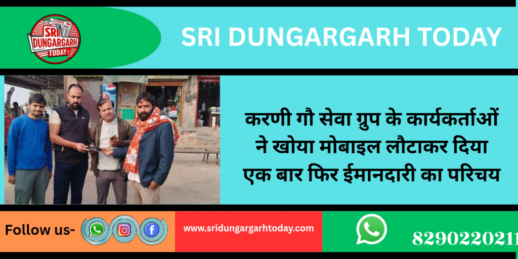 करणी गौ सेवा ग्रुप के कार्यकर्ताओं ने एक बार फिर ईमानदारी का परिचय दिया है। छपरा बिहार के रहने वाले और वर्तमान में कोलकाता में रह रहे एक परिवार का मोबाइल घूमचक्कर क्षेत्र में गुम हो गया। मोबाइल खोने के बाद पूरा परिवार परेशान होकर जगह-जगह तलाश कर रहा था।