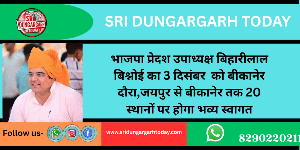 नोखा के पूर्व विधायक और भाजपा के नए प्रदेश उपाध्यक्ष बने बिहारीलाल बिश्नोई 3 दिसंबर को पहली बार अपने गृह जिले बीकानेर का दौरा करेंगे। पदभार ग्रहण के बाद पहली आमद को लेकर कार्यकर्ताओं में उत्साह चरम पर है। राजनीतिक सफर के इस नये अध्याय की खुशी में भाजपा कार्यकर्ता जयपुर से बीकानेर तक करीब 20 स्थानों पर भव्य स्वागत की तैयारी में जुट गए हैं।