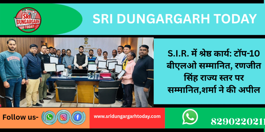 विशेष गहन पुनरीक्षण (S.I.R.) के तहत मतदाता सूची अपडेट कार्य में बेहतरीन प्रदर्शन करने वाले श्रीडूंगरगढ़ विधानसभा क्षेत्र के टॉप-10 बीएलओ को उपखंड प्रशासन ने सोमवार को सम्मानित किया। बीएलओ द्वारा गणना प्रपत्रों के वितरण, संकलन और ऑनलाइन डिजिटाइजेशन में दिखाए गए उत्कृष्ट कार्य के आधार पर चयन किया गया।