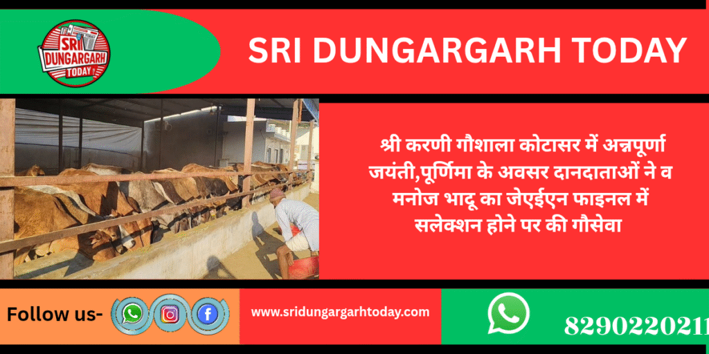अन्नपूर्णा जयंती पूर्णिमा के अवसर पर कोटासर की श्री करणी गौशाला में दानदाताओं ने बढ़-चढ़कर गौ सेवा की लंदन प्रवासी उपाध्याय परिवार ने दिवंगत सोमनाथ उपाध्याय पुणे की आत्म शांति के लिए सुपुत्रों ने ₹ 8675 की राशि समर्पित कर एक कढ़ाई खल मूंग चूरी गुड़ का भंडारा एवं 21मण मूंगफली चारा गौ माताओं को समर्पित किया, वहीं पूर्णिमा के अवसर पर मुंबई प्रवासी रामेश्वर लाल सुथार ने एक पेटि गुड़ ,पंचायत समिति श्री डूंगरगढ़ के जेईएन शिवलाल बिश्नोई अलाय, ग्राम विकास अधिकारी मानसिंह बणीरोत घंटेल एवं पवन कुमार सहित गौशाला पधार कर गौ माता को गुड़ खिलाकर गौ सेवा का सौभाग्य प्राप्त किया। 103 वर्षीय फैंपा देवी धर्मपत्नी दिवंगत बद्रीराम जोशी कोटासर हाल दुलचासर ने गौशाला पधारकर ₹500 की राशि समर्पित करते हुए गौ माताओं को गुड़ का पावन भोग लगाया वहीं लिखमीसर दिखनादा निवासी गौशाला के भामाशाह समाजसेवी हरिराम भादू लिखमीसर दिखनादा के सुपुत्र मनोज कुमार भादू का जेएईएन फाइनल सिलेक्शन होने पर ₹1100 की राशि समर्पित कर गौ वंश को गुड़ खिलाकर खुशियां मनाई गौशाला कमेटी ने मनोज भादू को बधाई देते हुए उज्जवल भविष्य की कामना की एवं समस्त दानदाताओं और भामाशाहों का जताया आभार।