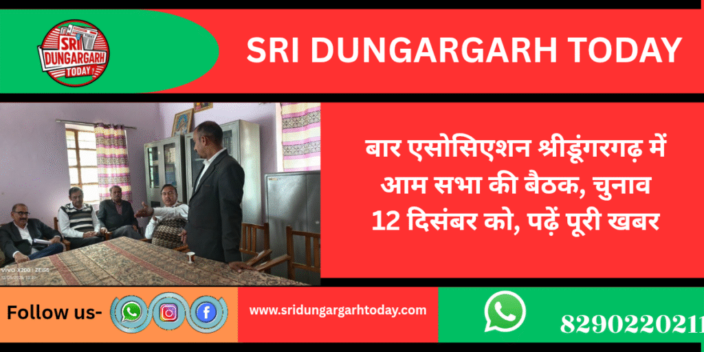 बार एसोसिएशन श्रीडूंगरगढ़ की आम सदन की बैठक आज आयोजित हुई। बैठक की अध्यक्षता अध्यक्ष सत्यनारायण प्रजापत और सचिव ओमप्रकाश मोहरा ने संयुक्त रूप से की। बैठक में वरिष्ठ अधिवक्ता भरत सिंह राठौड़, लेखराम चौधरी, बाबूलाल दर्जी, साजिद खान, पूनमचंद मारू, राधेश्याम दर्जी, कैलाश सारस्वत, गोपीराम जानू, ललित मारू, के.के. पुरोहित, जगदीश भाम्भू सहित बड़ी संख्या में अधिवक्ता उपस्थित रहे।