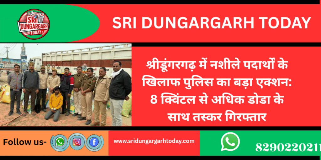 श्रीडूंगरगढ़ में लगातार पुलिस टीमों द्वारा अवैध डोडा के खिलाफ एक्शन जारी है। शेरूणा पुलिस ने बड़ी मात्रा में नशीला पदार्थ डोडा पोस्त जब्त किया है। नशीले पदार्थों के खिलाफ आईजी हेमंत शर्मा,एसपी कावेन्द्र सागर के निर्देशन में शेरूणा थानाधिकारी संध्या विश्नोई की टीम ने यह कार्रवाई की है। पुलिस टीम ने 46 कट्टों में भरा 838 किलो अवैध डोडा के साथ ट्रेलर चालक को पकड़ा है। पुलिस ने अवैध डोडा के साथ सुरेन्द्र कुमार जाट पुत्र भंवराराम निवासी मालकी ढ़ाणी, मांडली बालोतरा को गिरफ्तार किया है। पुलिस ने आरोपी के खिलाफ एनडीपीएस एक्ट के तहत मामला दर्ज कर जांच शुरू कर दी है।