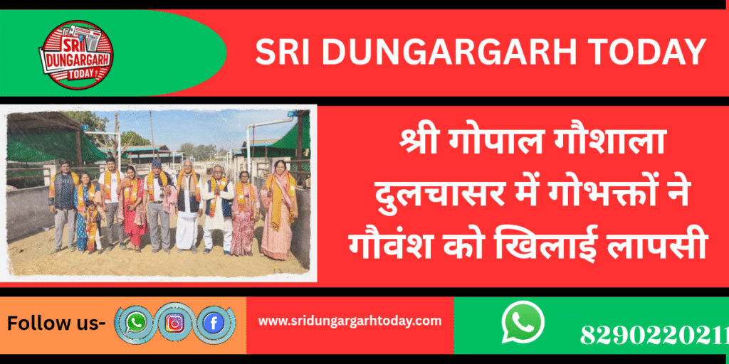 श्री गोपाल गौशाला दुलचासर में रविवार को पुनमचंद मुंधड़ा एंव धर्मपत्नी ज्याना दैवी, भ्राता श्याम सुंदर पौत्र अंकित पुत्रवधू पूजा, वैदान्त निवासी दुलचासर मुरलीधर सुशीला राठी निवासी श्री डूंगरगढ़, जितेंद्र व नितिशा चांडक निवासी गुड़ा ने गौशाला में पधारकर गौशाला का भ्रमण कर अवलोकन किया। सचिव रेवंतसिंह पड़िहार ने बताया कि इस दौरान सभी ने गौमाताओं को पौष्टिक आहार लापसी का पावन भंडारा कर अपने हाथों से भोग लगाया। गोशाला कमेटी ने सभी दानदाताओं को दुपट्टा पहनाकर कर स्वागत किया और आभार प्रकट करते हुए ईश्वर से सदैव सुख समृद्धि कि कामना की।