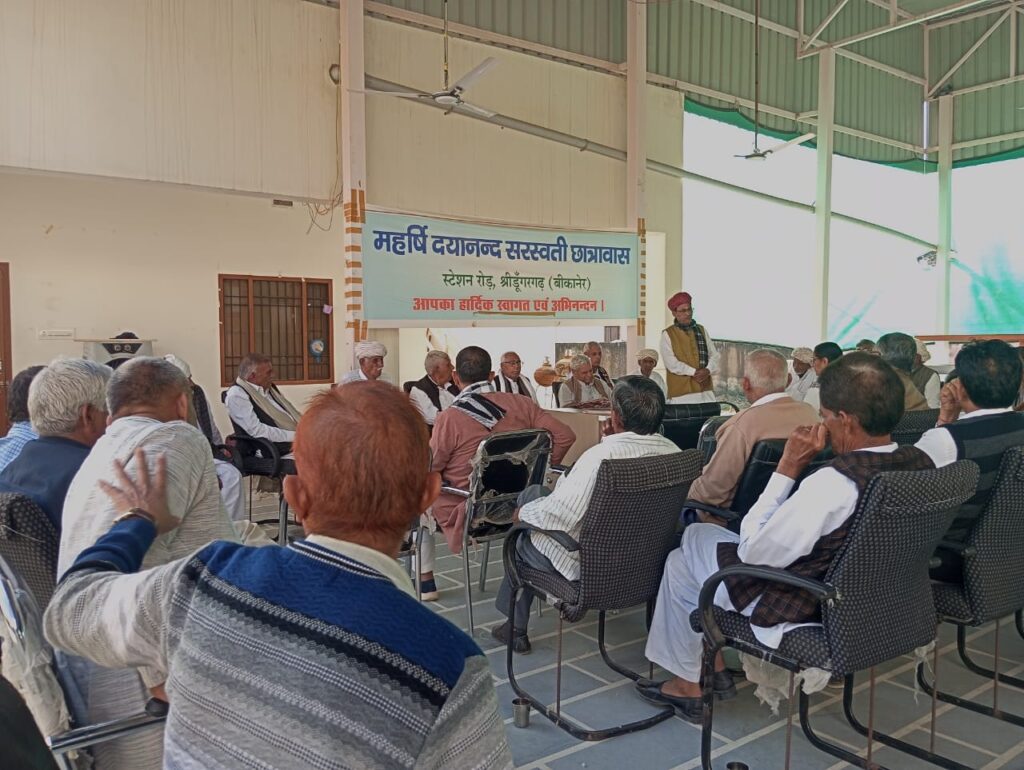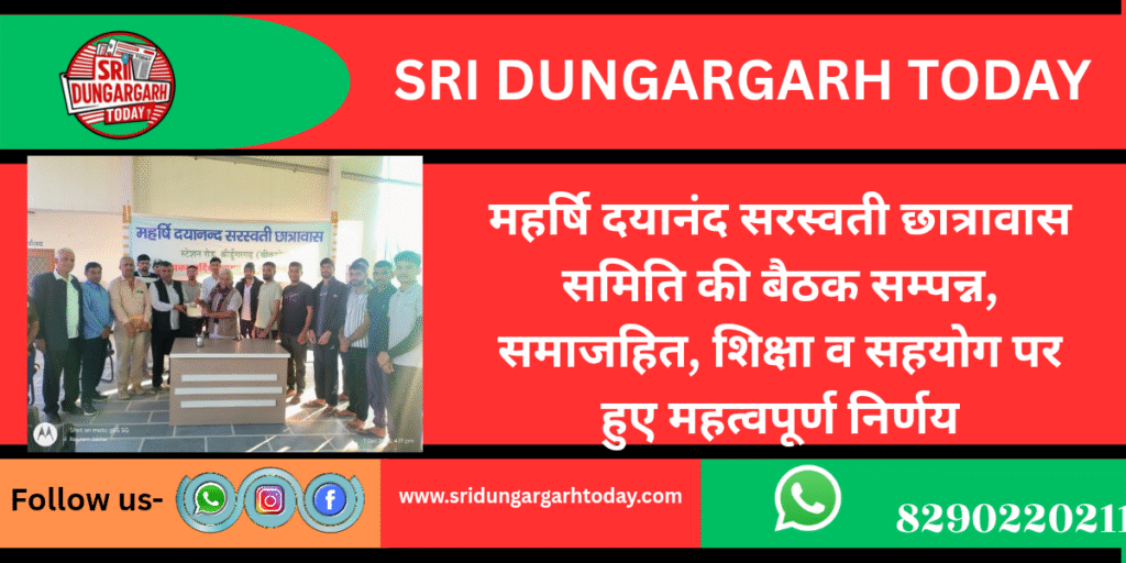 महर्षि दयानंद सरस्वती छात्रावास विकास समिति श्रीडूंगरगढ़ की बैठक एडवोकेट श्याम सुन्दर आर्य की अध्यक्षता में छात्रावास में आयोजित की गई । बैठक में मंत्री सुशील सेरडिया ने भवन निर्माण कार्य की प्रगति रिपोर्ट एवं बैठक का एजेण्डा प्रस्तुत किया जिस पर चर्चा की गई ।