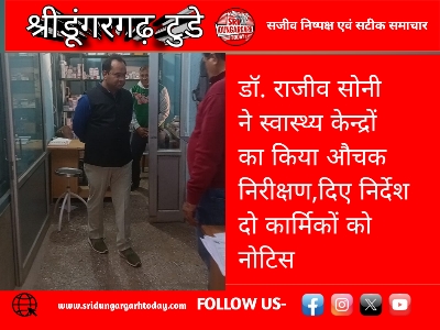 खण्ड मुख्य चिकित्सा अधिकारी श्रीडूंगरगढ़ डॉ. राजीव सोनी ने सोमवार को सामुदायिक स्वास्थ्य केन्द्र मोमासर व प्राथमिक स्वास्थ्य केंद्र तोलियासर का औचक निरीक्षण किया। निरीक्षण के दौरान चिकित्सा विभाग की योजनाओं की प्रगति, रिकॉर्ड संधारण व मरीजों को दी जा रही सेवाओं का गहन अवलोकन किया गया