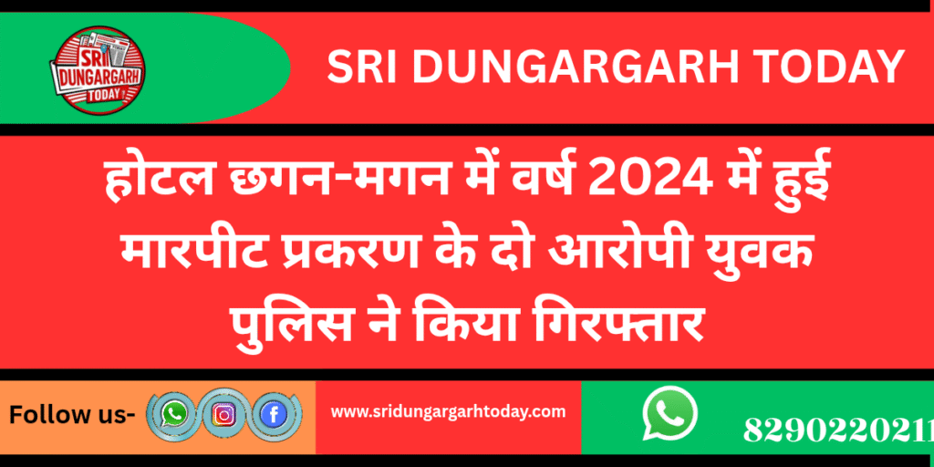 नेशनल हाइवे पर स्थित होटल छगन-मगन पर वर्ष 2024 में हुई मारपीट की पुरानी घटना में श्रीडूंगरगढ़ पुलिस ने 2 आरोपी युवकों को गिरफ्तार किया है। मामले के जांच अधिकारी एसआई राजेन्द्र कुमार ने बताया कि मामले के अनुसंधान में आरोपी गांव बेनिसर निवासी 20 वर्षीय मदनलाल जाट व 22 वर्षीय रामूराम जाट को मारपीट करने, जानलेवा चोटें पहुंचने का दोषी पाया गया व रविवार को पुलिस टीम ने दोनों आरोपियों को गिरफ्तार कर हवालात में डाला जहाँ उनसे पूछताछ जारी है। मामले की अगली कार्रवाई के तहत आज दोनों को न्यायालय में पेश किया जाएगा।