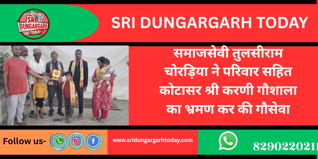 श्री करणी गौशाला कोटासर में मंगलवार को समाजसेवी व गौसेवी तुलसीराम चोरड़िया श्रीडूंगरगढ़ ने अपने परिवार के साथ अपने पैतृक गांव कोटासर पधारकर भोमिया जी मंदिर में पूजा अर्चना की