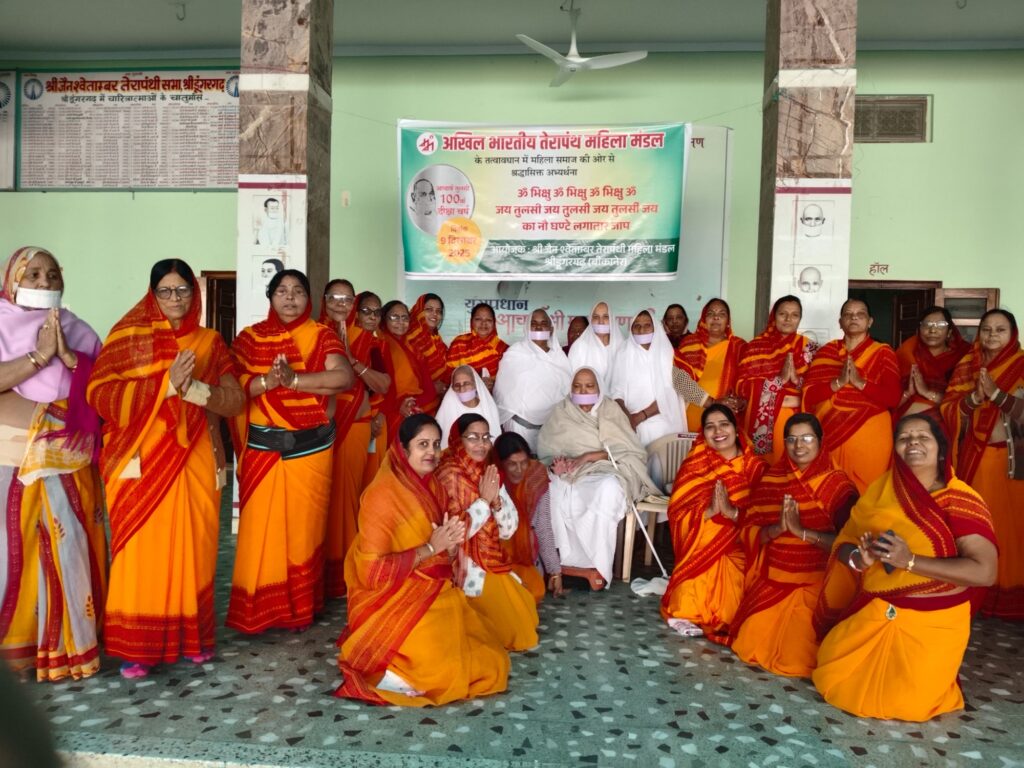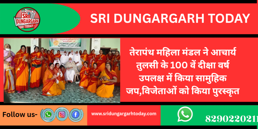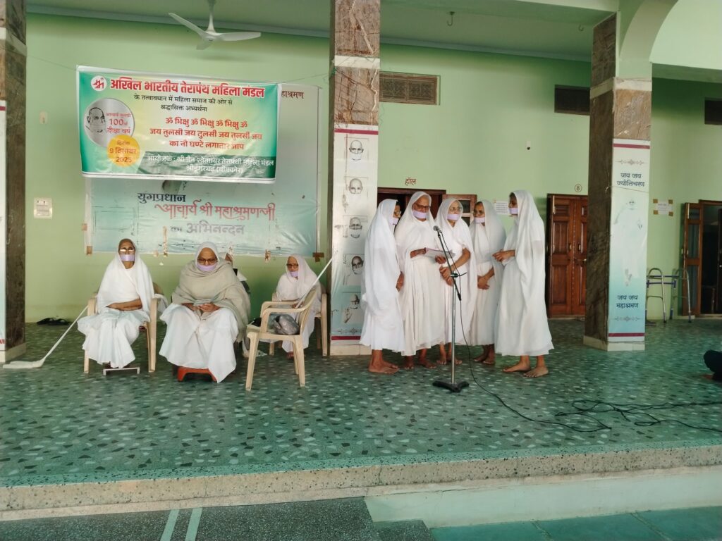 अखिल भारतीय तेरापंथ महिला मंडल के तत्वाधान में तेरापंथ महिला मंडल श्रीडूंगरगढ़ ने मंगलवार को स्थानीय सेवा केंद्र मालू भवन में केंद्र व्यवस्थापिका साध्वी संगीत श्री जी एवं साध्वी डॉ परम प्रभा जी के सानिध्य में तेरापंथ नवम अधिशास्ता आचार्य तुलसी के 100 वें दीक्षा वर्ष के उपलक्ष्य ने जप का आयोजन किया गया।