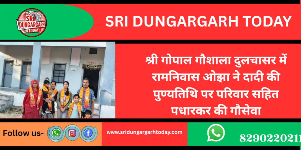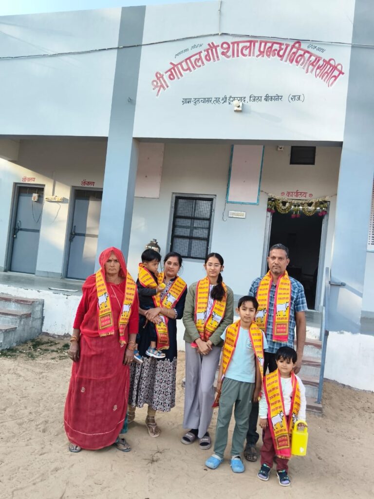 श्री गोपाल गौशाला दुलचासर में आज रामनिवास सुपुत्र तोलाराम ओझा निवासी दुलचासर अपनी माता,बहन प्रियंका पुत्री जानवी पुत्र कुंज भ्राता पुत्री कनिका भांजा राघव आज श्री गोपाल गौशाला दुलचासर सहित पधारकर ने अपनी दादी की पुण्यतिथि पर लापसी कि सामग्री गेहूं बाट एक क्विंटल 25 किलो, गुड 40 किलो, तेल 10 किलो समर्पित किया । सचिव रेवंतसिंह पड़िहार ने बताया कि रामनिवास के परिवार द्वारा निरंतर गौ सेवा जारी हैं। पूर्व में एक ट्राली मूंगफली चारा जिसका वजन 21 क्विंटल 51 किलो जो गौ माता एवं गोवंश के लिए समर्पित किया। गौशाला कमेटी ने ओझा परिवार का हार्दिक आभार प्रकट करते हुए ईश्वर से सदैव सुख समृद्धि कि कामना की।