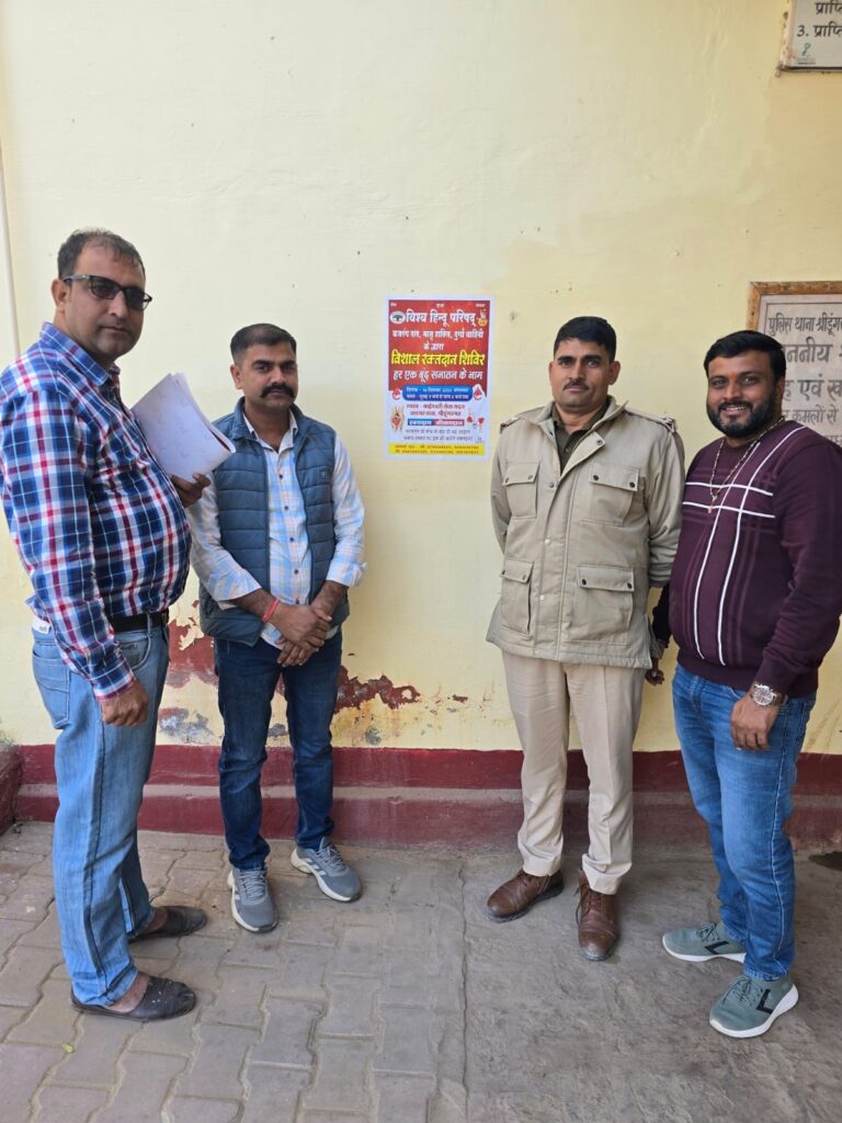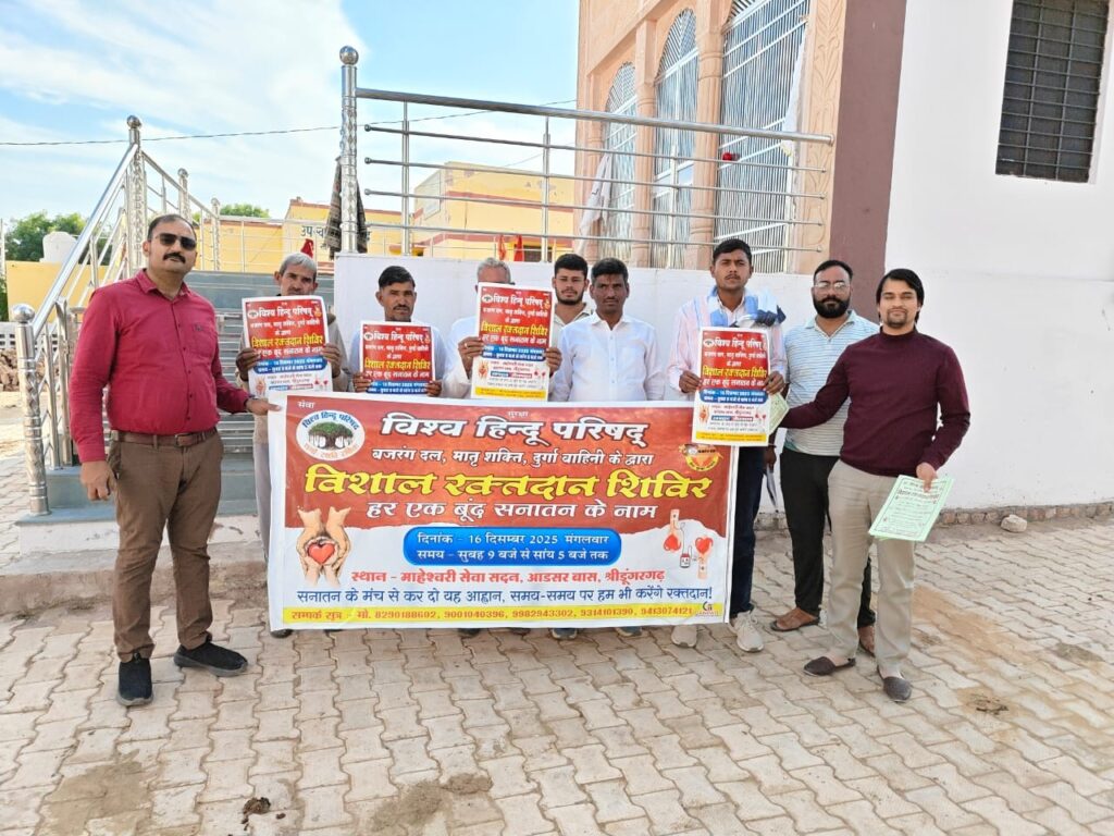 विश्व हिंदू परिषद द्वारा आगामी 16 दिसंबर 2025, मंगलवार को रक्तदान महाशिविर का आयोजन होगा। शिविर को लेकर आड़सर बास के माहेश्वरी भवन में आयोजन की तैयारियां जोर शोर जारी है। 16 दिसंबर मंगलवार सुबह 9 बजे भारत माता के पूजन से शिविर प्रारंभ होगा संगठन के सदस्य, बजरंग दल, मातृ शक्ति व दुर्गावाहिनी के दल रक्तदान करने की अपील करते हुए प्रचार प्रसार में जुटे है। जिसके लिए युवाओं की विभिन्न टोलियां बनाई गई है, जो गांव गांव ,ढाणी ढाणी व नगर की गली गली में घूम कर पीड़ित मानवता की सेवार्थ रक्तदान करने की अपील कर रही है। सदस्यों ने सरकारी कार्यालयों व ग्राम पंचायत भवनों, मुख्य बाजार, सहित विभिन्न स्थानों पर रक्तदान पोस्टर लगाए जा रहे है।