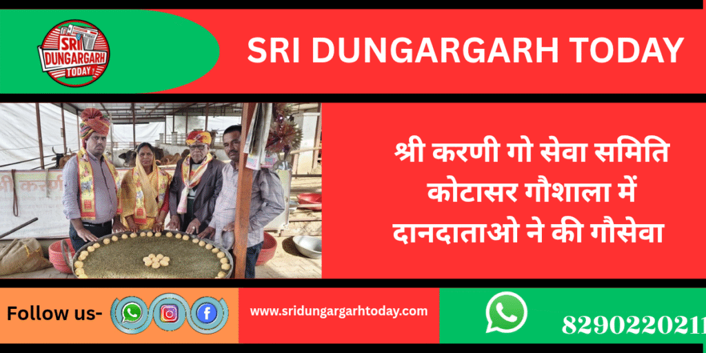 श्री करणी गो सेवा समिति कोटासर में गौशाला के भामाशाह परम गौ भक्त गोसेवी समाजसेवी शिवरतन सोमानी श्री डूंगरगढ़ हाल गुवाहाटी एवं धर्मपत्नी सुमन देवी सोमानी एवं शिव शंकर मूंधड़ा दुलचासर ने गौशाला में पधारे इस दौरान गौशाला कमेटी ने सभी का स्वागत और अभिनंदन किया। प्रबधंक अगरसिंह पड़िहार ने बताया कि शिवरतन सोमानी ने गौ माताओं को गुड़ का पावन भोग लगाकर गौ सेवा का सौभाग्य प्राप्त किया। वहीं मूंधड़ा परिवार के शिव शंकर मूंधड़ा दुलचासर ने गौशाला की गौ माताओं को एक कढ़ाई मुंगचूरी का अति पावन भंडारा गौ माताओं को भोग लगाकर गौ सेवा का सौभाग्य प्राप्त किया गौशाला कमेटी ने सभी भामाशाहों का आभार व्यक्त कर पूरे परिवार के लिए सुख समृद्धि की कामाना की