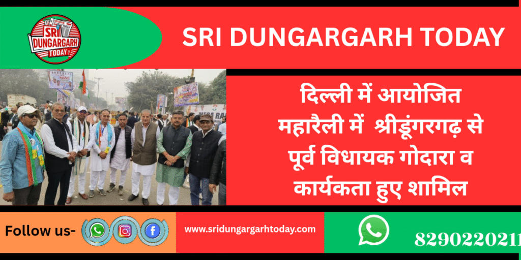 दिल्ली के रामलीला मैदान में कांग्रेस द्वारा ‘वोट चोर गद्दी छोड़’ महारैली का आयोजन किया गया। देश भर से कांग्रेस संगठन के पदाधिकारी, कांग्रेसी नेता व कार्यकर्ता महारैली में शामिल हुए। इसी क्रम में श्रीडूंगरगढ़ विधानसभा क्षेत्र के पूर्व विधायक मंगलाराम गोदारा अपने जोशिले कार्यकर्ताओं व समर्थको के साथ शामिल हुए इस दौरान पूर्व मंत्री भंवर सिंह भाटी शहर जिला अध्यक्ष मदन गोपाल जी मेघवाल प्रधान प्रतिनिधि केसराराम गोदारा कांग्रेस सेवादल के जिल अध्यक्ष रामनिवास गोदारा,मूलाराम भादू विमल भाटी सोहनलाल नैन प्रेम भादू डालूराम मेगवाल हेमाराम खिलेरी नानूराम नैन सांवतराम डूंगरराम भंवरलाल भागीरथ सूरजाराम तोलाराम दीपाराम लिछूराम नैण भागीरथ भूकर गंगराम गोदारा तोलाराम कड़वासरा नोपाराम गाट भूगानपूरी सीताराम बाना राजेश मंडा रामप्रताप भादू पेमाराम गोदारा सहित बड़ी संख्या में कार्यकर्ता भी सम्मलित हुए। वक्ताओं ने कहा कि यह लड़ाई केवल सत्ता की नहीं, बल्कि: लोकतंत्र की रक्षा की है। जनता के एक एक वोट की गरिमा बचाने की है। बाबा साहेब के संविधान को मजबूत करने की है। जब तक जनता का अधिकार सुरक्षित नहीं होगा तक यह संघर्ष जारी रहेगा।