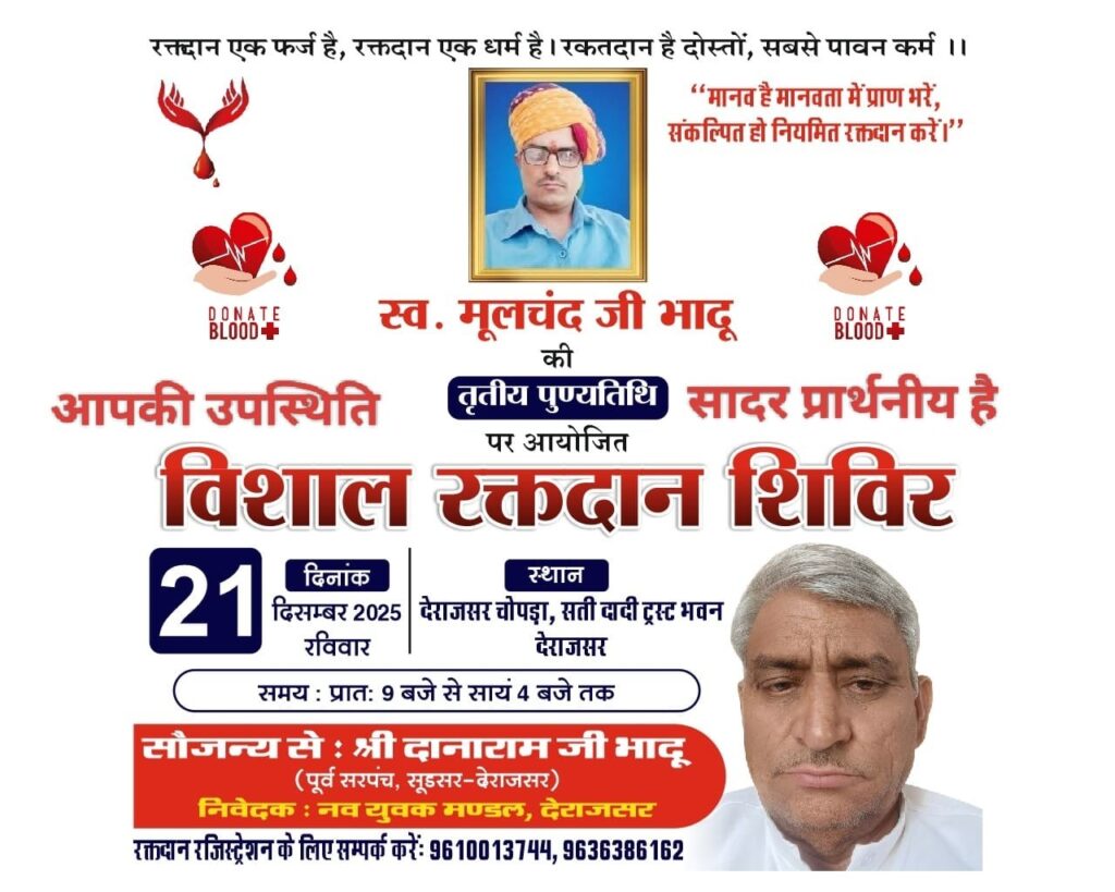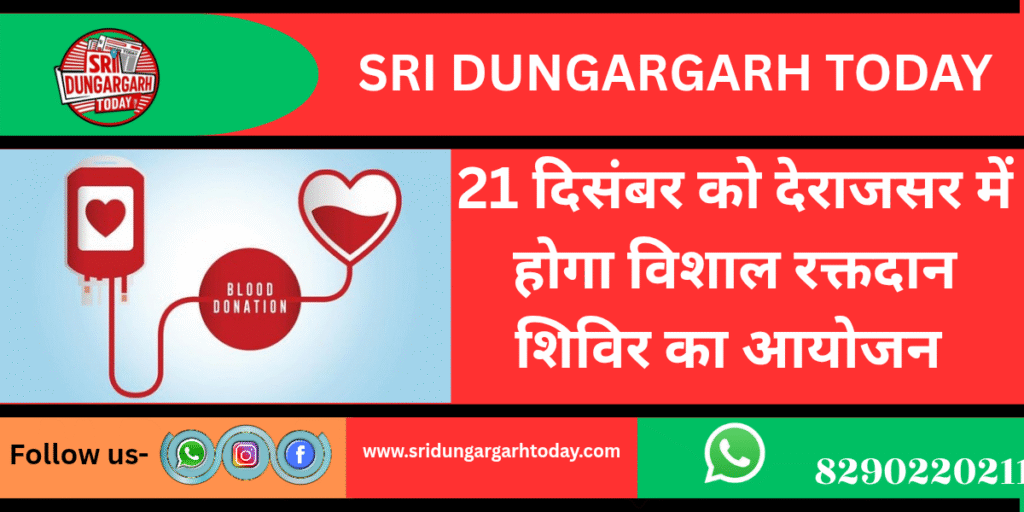 क्षेत्र के गांव देराजसर में गांव के नवयुवक मंडल द्वारा आगामी 21 दिसंबर 2025 को विशाल रक्तदान शिविर का आयोजन किया जाएगा।