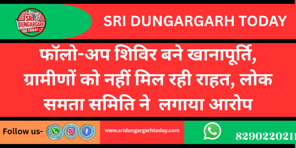प्रशासन द्वारा श्रीडूंगरगढ़ तहसील में गिरदावर मुख्यालय पर फॉलो-अप शिविर लगाए जा रहे हैं, लेकिन ये शिविर ग्रामीणों के लिए राहत के बजाय महज औपचारिकता बनकर रह गए हैं। इन शिविरों में लंबित एवं बकाया प्रकरणों के निस्तारण के निर्देश दिए गए हैं, जबकि इससे पहले गांवों में लगाए गए कई शिविरों के काम आज तक अधूरे पड़े हैं। यह आरोप लोकसेवा समिति ने लगाया