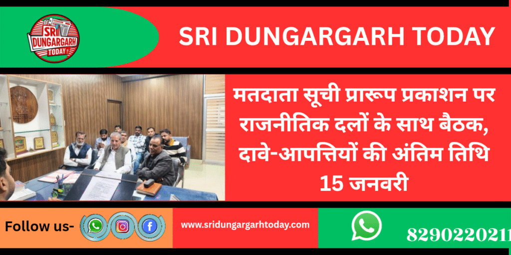 भारत निर्वाचन विभाग के निर्देशानुसार विशेष गहन पुनरीक्षण कार्यक्रम 2025  के तहत  विधानसभा निर्वाचन क्षेत्र श्रीडूंगरगढ़ की मतदाता सूचियों का प्रारूप  का प्रकाशन मंगलवार को किया गया। इसके संबंध में निर्वाचक रजिस्ट्रीकरण पदाधिकारी एवं उपखण्ड अधिकारी शुभम शर्मा की अध्यक्षता में राजनैतिक दलों के बीएलए प्रथम / प्रतिनिधियों के साथ बैठक आयोजित की गयी।