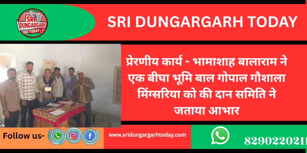 एक फीट जमीन के लिए भी आज लोग मरने-मारने पर उतारू हो जाते हैं लेकिन क्षेत्र के मिंग्सरिया गांव में एक भामाशाह ने अपनी खातेदारी जमीन में से 1 बीघा जमीन गौशाला को दान कर एक मिशाल पेश की है। गौशाला सेवा समिति के अध्यक्ष ने बताया कि राजस्थान को यों ही भामाशाहों की धरा नहीं कहा जाता। यहां सेवा का भाव कूट-कूटकर भरा हुआ है। विशेषकर गोवंश के लिए तो मारवाड़ के लोग बढ़-चढक़र दान देते हैं। ये परम्परा सदियों से चली आ रही है। सेवा का ऐसा ही भाव बुधवार को मिंग्सरिया में देखने को मिला जहाँ भामाशाह बलाराम पुत्र मालाराम प्रजापत ने अपने खातेदारी खेत से से एक बीघा भूमि बाल गोपाल गौशाला समिति को दान कर दी तथा उक्त भूमि को समिति अध्यक्ष तुलछीराम प्रजापत,सचिव लक्ष्मणसिंह, उपाध्यक्ष राजकुमार,मंत्री मनीराम गोदारा व मोतीराम प्रलेख लेखक उपस्थित में समिति को सौप दी है। तथा उक्त भूमि को उपहार स्वरूप तहसील कार्यालय में पजीकल करवा लिया गया है। गौशाला सेवा समिति के अध्यक्ष सहित ग्रामीणों ने दानदाता का आभार जताते हुए धन्यवाद ज्ञापित किया।