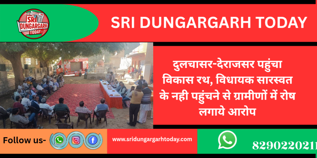 राज्य सरकार के 2 वर्ष पूर्ण होने के अवसर पर जनता को सरकार की उपलब्धियां और फ्लैगशिप योजनाओं से रूबरू कराने के लिए मंगलवार को दुलचासर, गोपालसर, देराजसर गांव में विकास रथ पहुंचा। लेकिन कार्यक्रम में क्षेत्रीय विधायक ताराचंद सारस्वत के ताराचंद सारस्वत के नहीं पहुंचने से लोगों को निराशा हाथ लगी। ऐसे में विधायक के प्रतिनिधि के रूप में पहुंचे भाजपा देहात मंडल अध्यक्ष महेन्द्र सिंह ने कहा कि विकास रथ अभियान न केवल सरकार की उपलब्धियों को जनता तक पहुंचने का माध्यम बन रहा है बल्कि ग्रामीण स्तर पर जनसंपर्क और जागरूकता को भी सशक्त बनाने का महत्वपूर्ण कदम साबित हो रहा है। अतिरिक्त विकास अधिकारी रामदयाल जाखड़ ने राज्य सरकार की जनकल्याणकारी योजनाओं की जानकारी दी। विधायक ताराचंद सारस्वत के नहीं आने पर लोगों ने अपनी मांगों के ज्ञापन भाजपा देहात मंडल अध्यक्ष महेन्द्र सिंह को सौंपे। कार्यक्रम में पूर्व सरपंच मोडाराम महिया,भाजपा कार्यकर्ता छेलूसिंह पड़िहार, रामनिवास महिया, बाबूलाल जाजड़ा, ओमप्रकाश सोनी, ग्राम विकास अधिकारी श्रीमती संतोष सारस्वत, सोहनलाल मेघवाल आदि उपस्थित रहे।