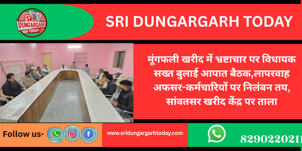समर्थन मूल्य पर मूंगफली खरीद को लेकर उठ रहे सवालों, वायरल वीडयो के चर्चाओं और किसानों के बढ़ते आक्रोश के बीच श्रीडूंगरगढ़ विधायक ताराचंद सारस्वत ने कड़ा रुख अपनाते हुए गुरुवार को उपखंड कार्यालय में आपात बैठक बुलाई गयी बैठक में विधायक ने साफ शब्दों में कहा- किसानों के हक से खिलवाड़ करने वालों को किसी भी कीमत पर बख्शा नहीं जाएगा।