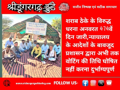 शराब ठेके के विरुद्ध धरना अनवरत 474वें दिन जारी,न्यायालय के आदेशों के बावजूद प्रशासन द्वारा अभी तक वोटिंग की तिथि घोषित नहीं करना दुर्भाग्यपूर्ण