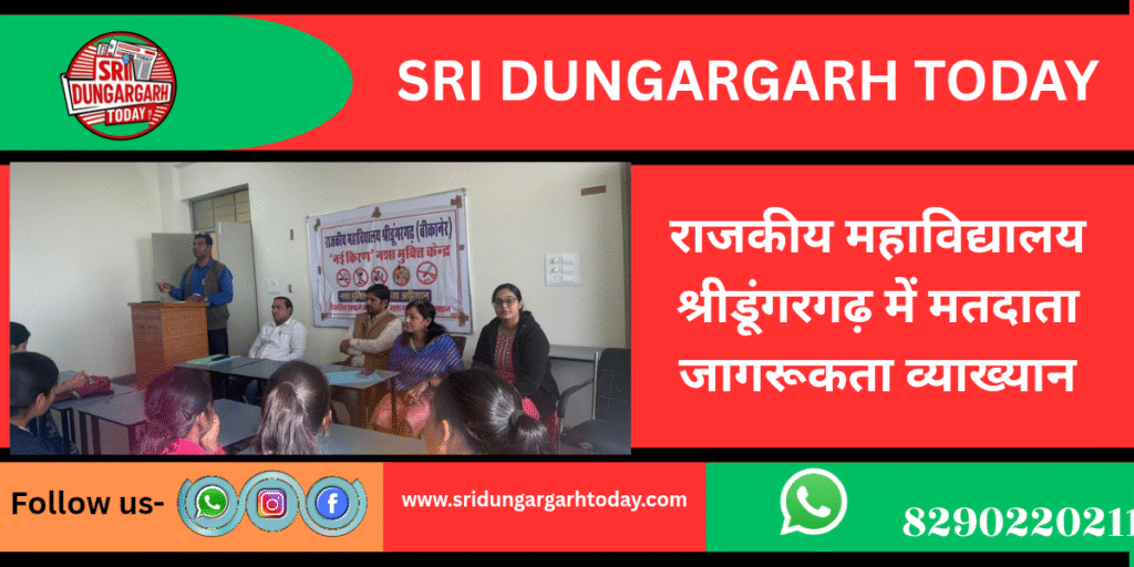राजकीय महाविद्यालय श्रीडूंगरगढ़ में शुक्रवार को मतदाता जागरूकता कार्यशाला का आयोजन किया गया। निर्वाचन विभाग के प्रशिक्षक पवन कुमार व डॉ मनीष सैनी ने विद्यार्थियों को एसआईआर के बारे में विस्तार से जानकारी दी।