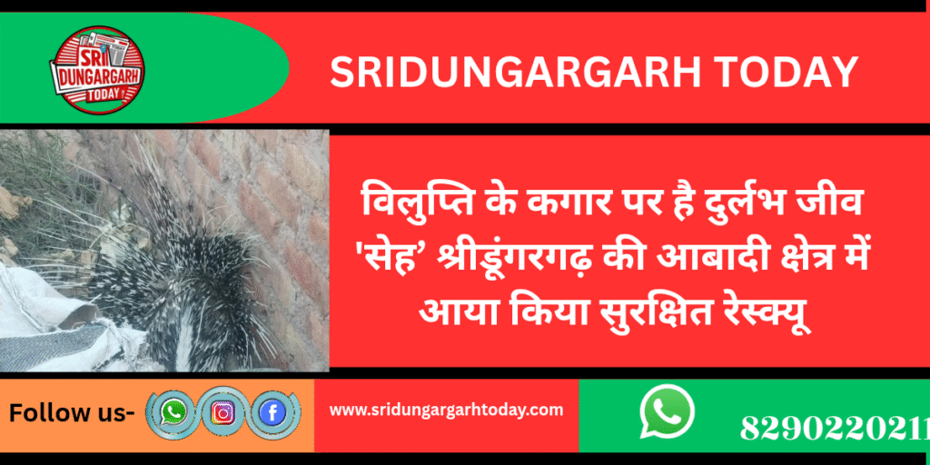 कालू बास क्षेत्र में आबादी के बीच एक दुर्लभ जीव ‘सेह’ दिखाई देने से कौतूहल बन गया। स्थानीय निवासी बनवारी सोनी ने इसकी सूचना आपणों गाँव श्रीडूंगरगढ़ सेवा समिति को दी। सूचना पर समिति के सेवादार दिव्यांश और वन विभाग के रोहिताश मौके पर पहुंचे और सुरक्षित रेस्क्यू किया।