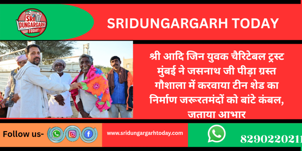 श्री आदि जिन युवक चैरिटेबल ट्रस्ट मुंबई के द्वारा श्री जसनाथ जी पीड़ा ग्रस्त गौशाला कल्याणसर नया में एक टीन शेड का निर्माण करवाकर गौशाला को समर्पित किया है। गौशाला अध्यक्ष हड़मानाराम गोदारा ने बताया कि इसी के साथ एक्सीडेंटल घायल गोवंश के लिए दवाई एवं उपचार करने के उपकरण भी गौशाला में समर्पित किए हैं। इसके अलावा ट्रस्ट ने बढ़ती हुई सर्दी मौसम को देखते हुए क्षेत्र के गांव कल्याणसर नया में जरूरतमंदों के लिए कंबल का वितरण किया गया।