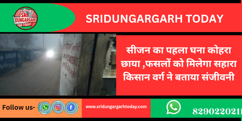 दिसंबर का महीना समाप्ति की और है।इस बार कोहरे एवं ठंड नहीं बढ़ने से फसलों पर संकट के बादल मंडरा रहे थे जिसके चलते किसान वर्ग मायूस था क्योंकि कोहरे एवं ठंड के अभाव में फसलों का विकास प्रभावित होता दिखाई दे रहा था आज श्री डूंगरगढ़ अंचल में सीजन का पहला घना कोहरा देखने को मिला। किसानों ने बताया यह घना कोहरा फसलों के लिए संजीवनी बुटी का काम करेगा ।किसानों का कहना है कि इस बार सर्दी नहीं बढ़ने एवं दोपहर में तेज धूप के कारण फसलों पर संकट के बादल साफ दिखाई दे रहे थे जिसके चलते फसलों में बढ़तवार नाम मात्र का रह गई थी।
