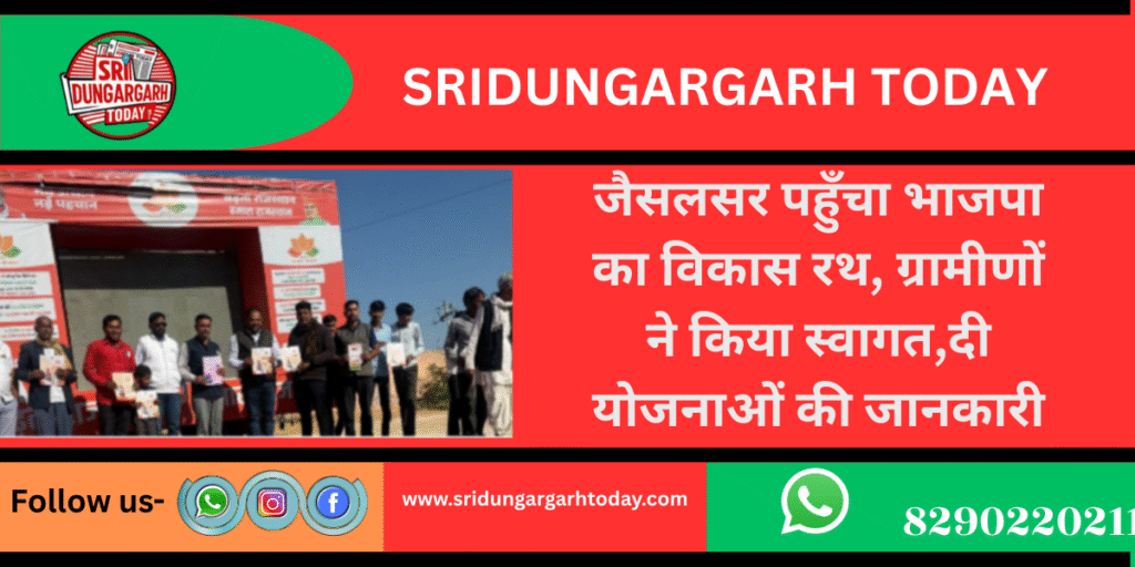 राज्य सरकार के दो वर्ष पूरे होने पर बुधवार को विकास रथ ग्राम पंचायत जैसलसर पहुँचा। ग्रामीणों ने रथ का पुष्पवर्षा कर भव्य स्वागत किया।