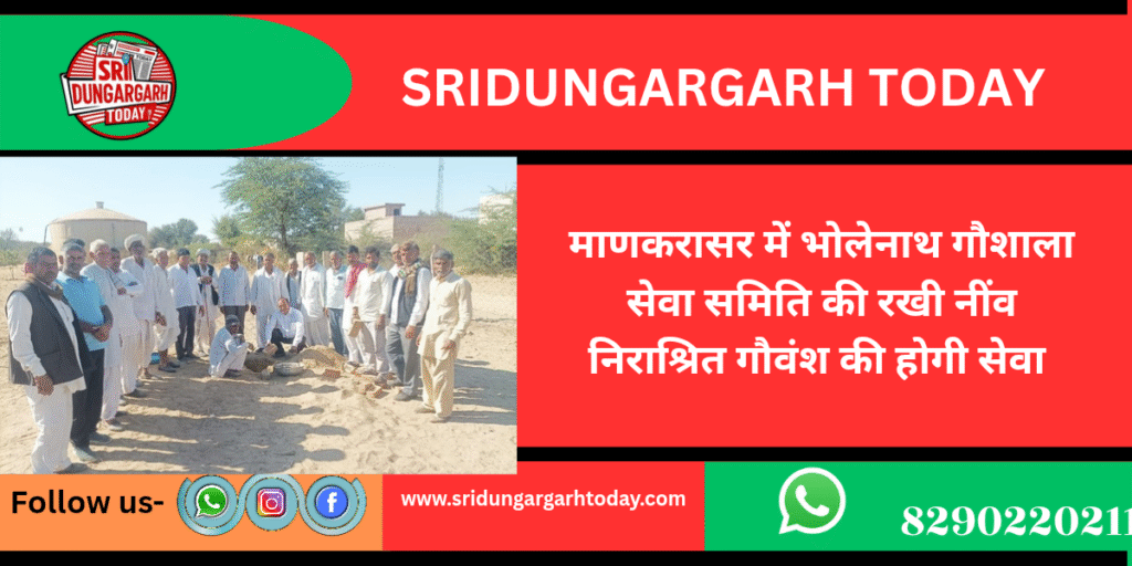 क्षेत्र के गांव माणकरासर में अब निराश्रित गौवंश की सेवा के लिए भोलेनाथ गौशाला सेवा समिति  गौशाला निर्माण होगा। बुधवार को गौशाला निर्माण के लिए नींव रखी गई। गौसेवा संघ अध्यक्ष सत्यनारायण स्वामी ने नींव रखते हुए गौसेवा को चारों पुरूषार्थ को देने वाली बताई। स्वामी ने कहा कि गौसेवा से व्यक्ति मन की शांति व मनोकामनाएं पूर्ण करने वाली है। स्वामी ने दानदाताओं से गौशाला में सहयोगी बनने का आह्वान किया। इस दौरान ग्रामीणों ने प्रसन्नता जताई और गौसेव का संकल्प लिया। इस दौरान भागीरथ मेहरा, सहीराम, मुखराम कुलड़िया, डूंगरसिंह राजपूत, अमाराम पूनियां, भागीरथ भूकर, ओमप्रकाश शर्मा, रेंवतराम भामूं, रेवंतराम कुलड़िया, हेतराम कुलड़िया, पुराराम नायक, दानाराम भूकर, मांगीलाल मेहरा, ईश्वरराम भूकर, गुलारम भूकर, सांवतराम सियाग, भीखाराम कुलड़िया, भादूराम भूकर, मनोजसिंह राजपूत, नंदलाल शर्मा, मुखराम शर्मा, बालकिशन, श्यामसुंदर स्वामी, बालकिशन पारीक पूजा में शामिल रहें। सभी ने गौसेवा निर्माण में सहयोग देने व दानदाताओं को सहयोग के लिए प्रेरित करने की चर्चा की, ग्रामीणों ने बताया कि इस मौके पर 50 गौवंश भी गौशाला में एकत्र कर लिया गया है।