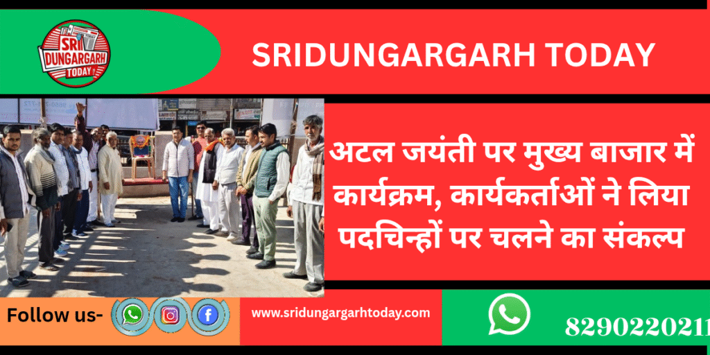 मुख्य बाजार में गुरुवार को भारत रत्न व पूर्व प्रधानमंत्री अटल बिहारी वाजपेयी की जन्मजयंती पर भाजपा कार्यकर्ताओं ने कार्यक्रम आयोजित किया। वक्ताओं ने अटल बिहारी वाजपेयी के राष्ट्र निर्माण में योगदान को प्रेरणादायी बताया और उनके विचारों को आत्मसात करने का आह्वान किया।