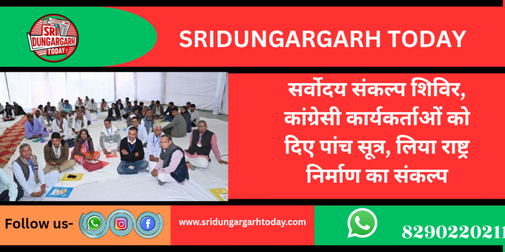 डॉ. यादव ने कार्यकर्ताओं को पाँच सूत्र पूर्वाग्रह और अहंकार का त्याग, रचनात्मक और सामाजिक गतिविधियों से जुड़ाव, नैतिकता और पारदर्शिता, अहिंसा व करुणा का व्यवहार, अन्याय के विरुद्ध नैतिक साहस के संकल्प का सर्वोदय संकल्प दिलवाया। डॉ यादव ने कहा कि जब आम आदमी महंगाई, बेरोज़गारी और असुरक्षा से जूझ रहा हो, तब कांग्रेस कार्यकर्ता का दायित्व और भी बढ़ जाता है। शिविर में श्रीडूंगरगढ़ क्षेत्र के 500 से ज्यादा कांग्रेस कार्यकर्ता भाग ले रहे है एवं शुक्रवार को संगठन के राष्ट्रीय अध्यक्ष डॉ सुनील पंवार भी कार्यकर्ताओं से रूबरू होंगे।