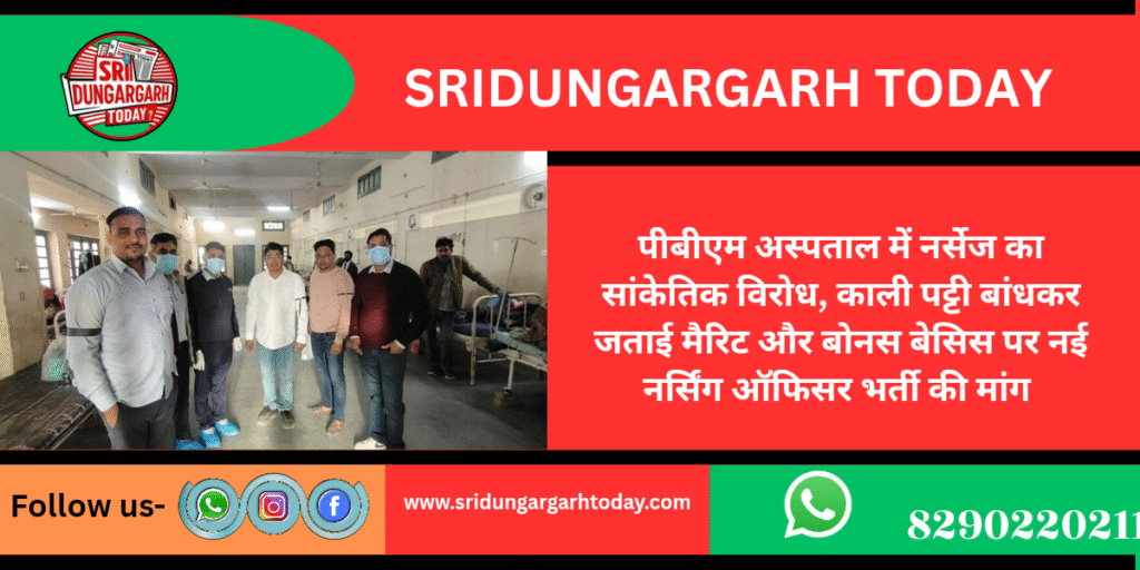 राजस्थान नर्सेज एसोसिएशन एकीकृत के प्रदेश नेतृत्व के आह्वान पर मेरिट और बोनस बेसिस पर नई नर्सिंग ऑफिसर की भर्ती करवाने हेतु सरदार पटेल मेडिकल कॉलेज & पीबीएम हॉस्पिटल बीकानेर के समस्त विभागों संगठन के जिलाध्यक्ष श्योपत गोदारा के आह्वान पर काली पटी बांध कर राज्य सरकार का ध्यान आकर्षक कर अपना सांकेतिक मैसेज पहुंचाने का काम किया जिसमें सभी नर्सेज की भागीदारी ,एकता और सहयोग निश्चित रूप से काबिले तारीफ रहा