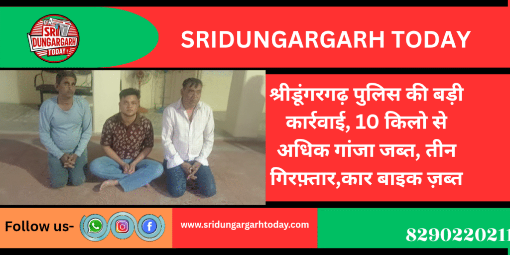 श्रीडूंगरगढ़ पुलिस ने मादक पदार्थों की तस्करी के खिलाफ बड़ी कार्रवाई करते हुए 10.032 किलोग्राम गांजा, एक कार और एक मोटरसाइकिल जब्त कर तीन आरोपियों को गिरफ्तार किया है। यह कार्रवाई शुक्रवार को दशहरा मैदान मार्ग स्थित चाणक्य लाइब्रेरी के पास की गई।