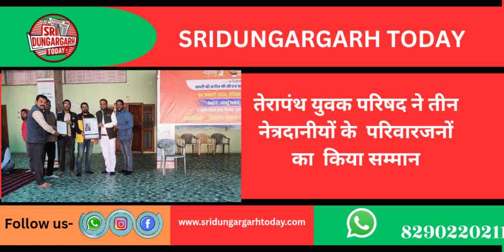 तेरापंथ युवक परिषद श्रीडूंगरगढ़ द्वारा नेत्रदान संयोजक अशोक झाबक के निर्देशन मे संचालित नेत्रदान महावरदान के तहत तीन अलग अलग नेत्र दानियो द्वारा किए गए नेत्रदान के उपरांत आज उनके परिजनों को सम्मानित कर प्रमाण पत्र प्रदान किए गए।