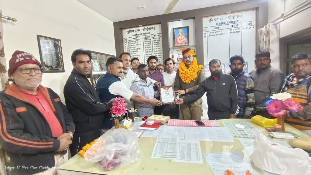 श्रीडूंगरगढ़ पुलिस थाना परिसर में शनिवार को नव पदस्थापित थानाधिकारी कश्यप सिंह राघव का मानवाधिकार एवं आरटीआई जागरूकता समिति की ओर से स्वागत अभिनंदन किया गया। इस दौरान थानाधिकारी ने कहा कि क्षेत्र की यातायात व्यवस्था को दुरुस्त करना, नशा तस्करी पर सख्ती और कानून-व्यवस्था बनाए रखना उनकी प्राथमिकताओं में शामिल रहेगा।