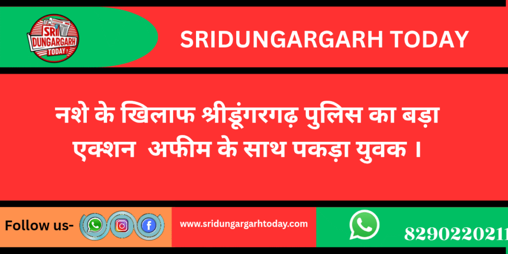 अवैध मादक पदार्थों के खिलाफ चलाए जा रहे अभियान के तहत श्रीडूंगरगढ़ पुलिस ने बड़ी कार्रवाई को अंजाम देते हुए 100 ग्राम अवैध अफीम के साथ एक युवक को गिरफ्तार किया है। यह कार्रवाई बिग्गा गांव में मंदिर के पास की गई, जिससे क्षेत्र में हड़कंप मच गया।