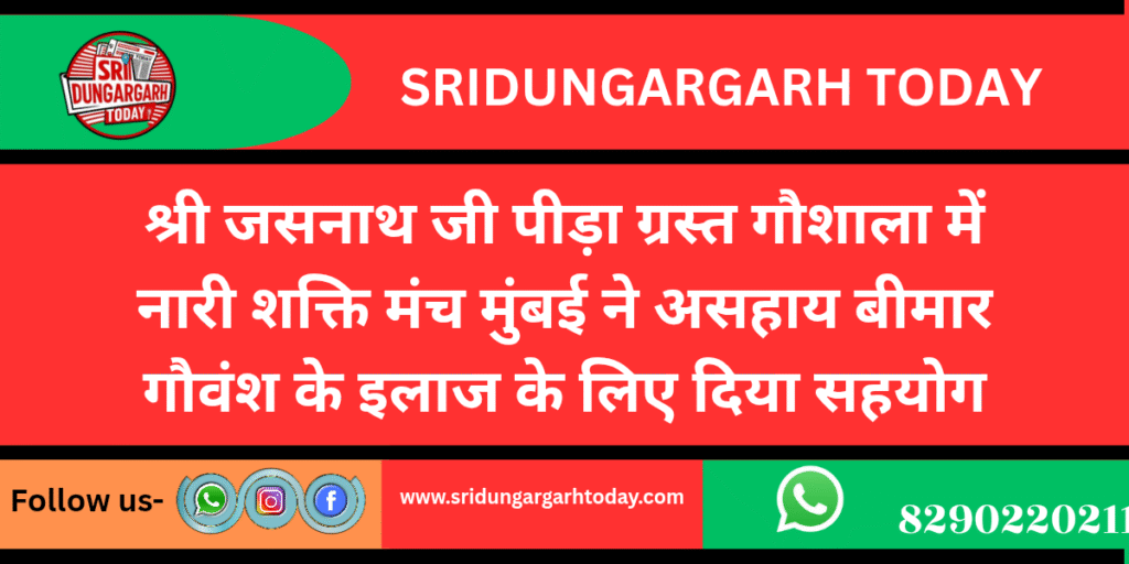 क्षेत्र के गांव कल्याण सर नया में स्तिथ श्री जसनाथ जी पीड़ा ग्रस्त गौशाला जहाँ सेवा ही परमो धर्म की भावना से बीमार, विकलांग, रोड एक्सीडेंट से घायल, अंधी, व वृद्ध गौमाताओं की सेवा की जाती है। इस गौवंश की सेवा के लिए निरंतर भामाशाहों के द्वारा सहयोग दिया जा रहा है। आज श्री गौ सेवा चैरिटेबल ट्रस्ट मुंबई के माध्यम से नारी शक्ति मंच मुंबई की तरफ से श्री जसनाथ जी पीड़ा ग्रस्त गौशाला में बीमार कमजोर गौ माता के लिए ₹ 11000 का सहयोग दिया जिसमें से ₹ 5500 रुपए की दवाई की सेवा और ₹ 5500 रुपये की स्वादिष्ट मिट्टी गुड़ की लापसी के लिए सहयोग देकर गौ माता से आशीर्वाद प्राप्त किया गौशाला कमेटी सहित गौशाला के अध्यक्ष हनुमान ने नारी शक्ति मंच मुंबई को धन्यवाद ज्ञापित करते हुए ट्रस्ट के सभी गणमान्य मेंबरों से अपील की है की घायल और कमजोर गौ माताऔ के लिए दवाई की और पोस्टिक आहार की बहुत आवश्यकता होती है आप के सहयोग इन गौवंश को समय पर इलाज मिलने से नया जीवन व शक्ति मिलती है। साथ ही आपके सहयोग से गौभक्तों का सेवा करने का मनोबल बढ़ता है।